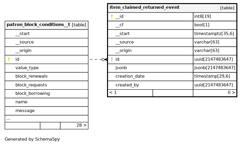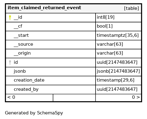 | item_claimed_returned_event_pkey | Primary key | Asc | __id |